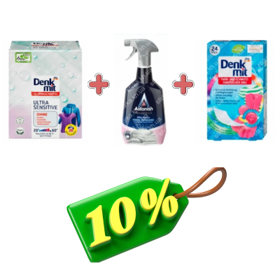 Набір для догляду за кольоровою білизною забезпечує безпечне та свіже прання. Пральний порошок Denkmit Ultra Sensitive дбайливо очищає речі та підходить навіть для чутливої шкіри, серветки запобігають линянню й змішуванню кольорів, а спрей-нейтралізатор Astonish дарує тканинам чистий та приємний аромат. Ідеальне рішення для яскравих і доглянутих речей.