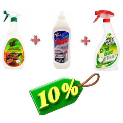 Набір ефективних засобів для прибирання Well Done: потужний знежирювач для кухні Hideg Zsiroldo швидко справляється навіть із застарілим жиром, засіб Well Done Fine повертає блиск металевим поверхням, а спрей Carpet Cleaner освіжає та очищує килими. Комплексне рішення для чистоти у всьому домі.